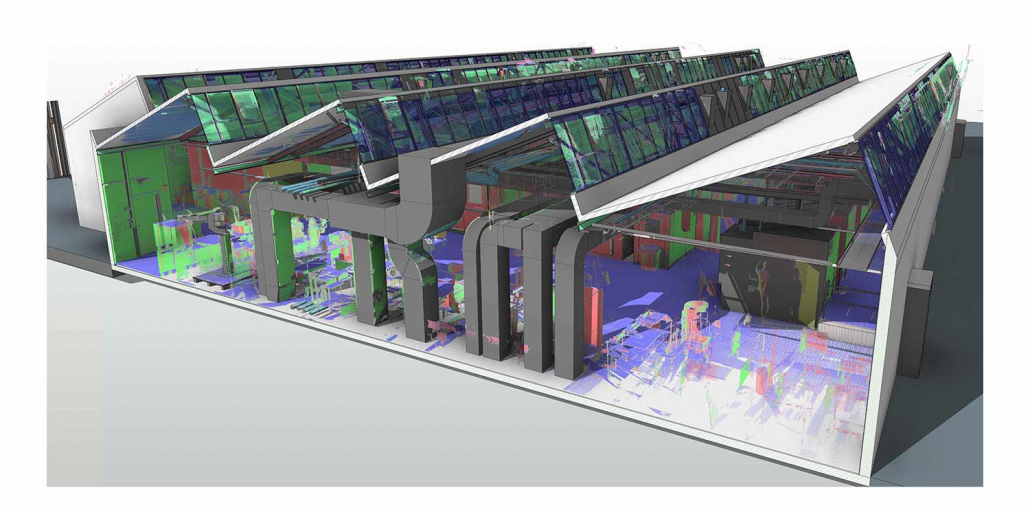 Einszueins: Laserscan des Innenraumes und des Gebäudeumrings. Punktwolke erstellt. Photogrammetrisches Fassadenaufmaß mittels UAV (Drohne mit Kameras). Daraus Grundrisse, Schnitte und Ansichten im CAD erstellt. Darstellung von True-Ansichtsmessbildern als Fassadendokumentation.